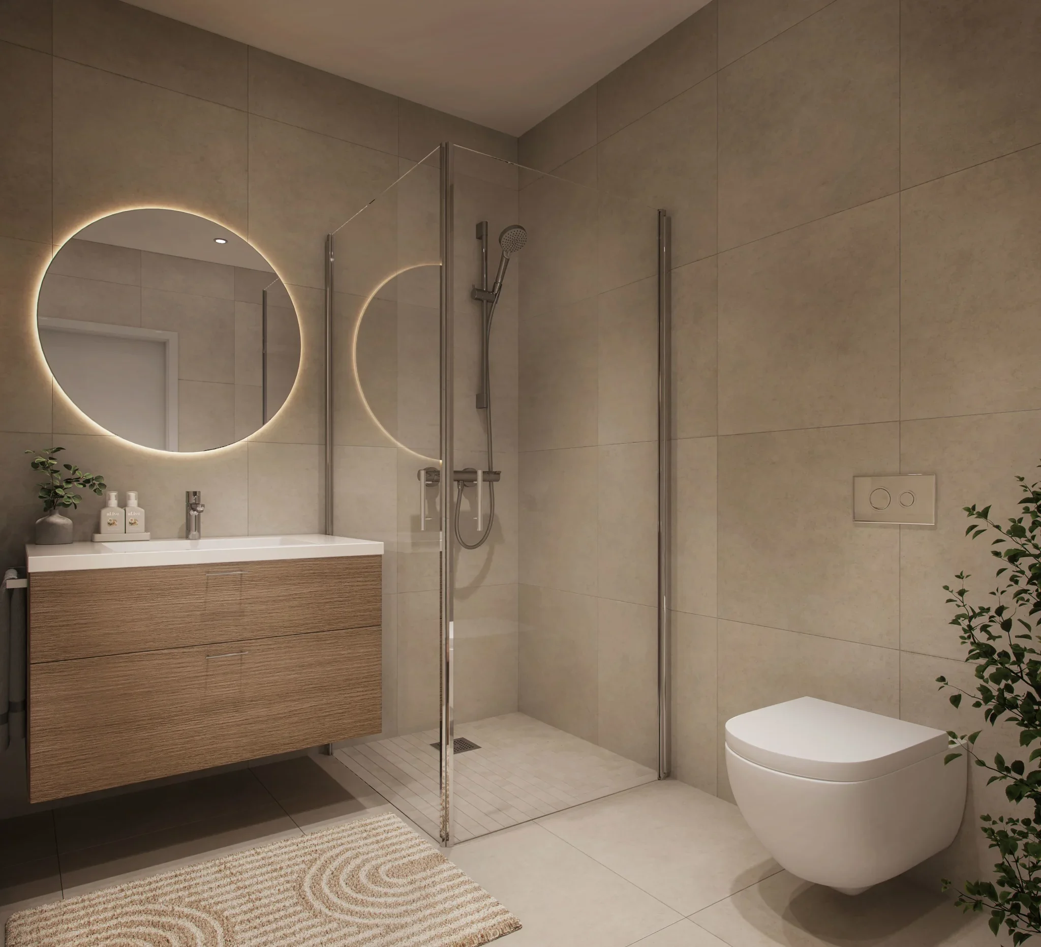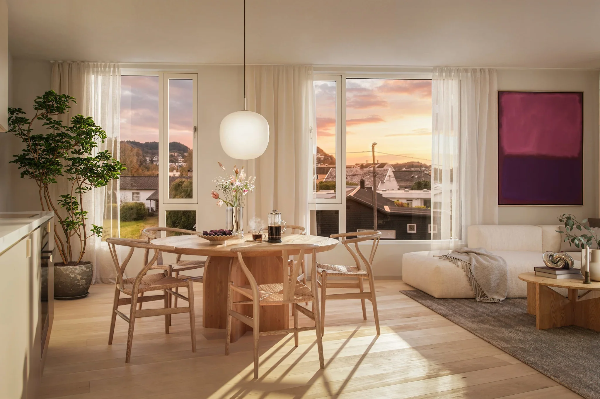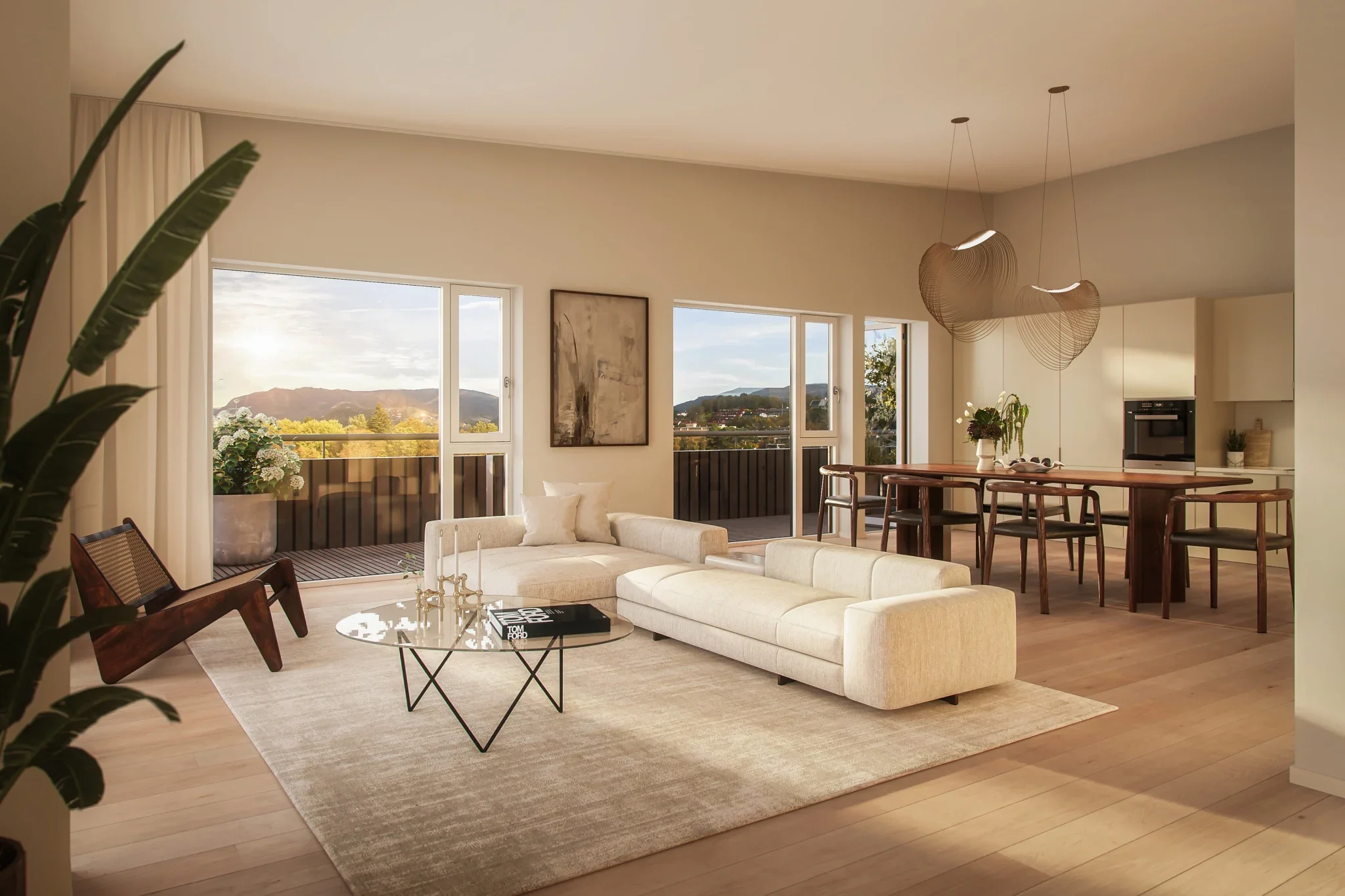 Prosjektets arkitektur er gjennomført og tidsriktig, med rene linjer og et uttrykk som glir naturlig inn i omgivelsene. Her får hver leilighet sin egen uteplass som gir både luft og privatliv. På taket kommer en stor, felles terrasse med plass til både ro og sosiale stunder.
